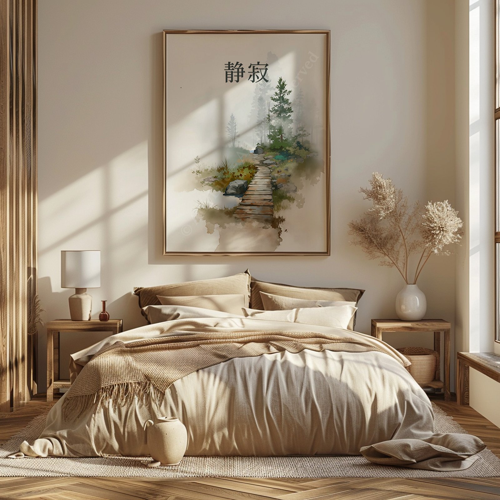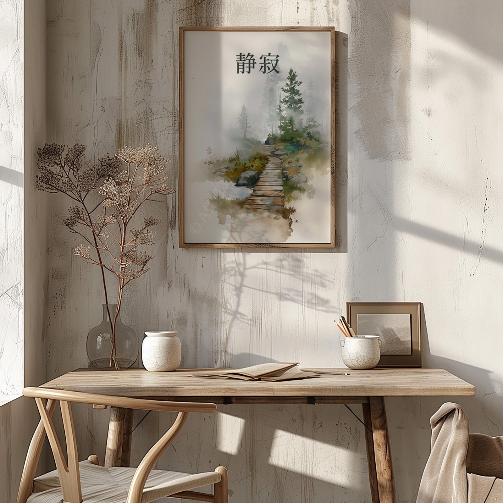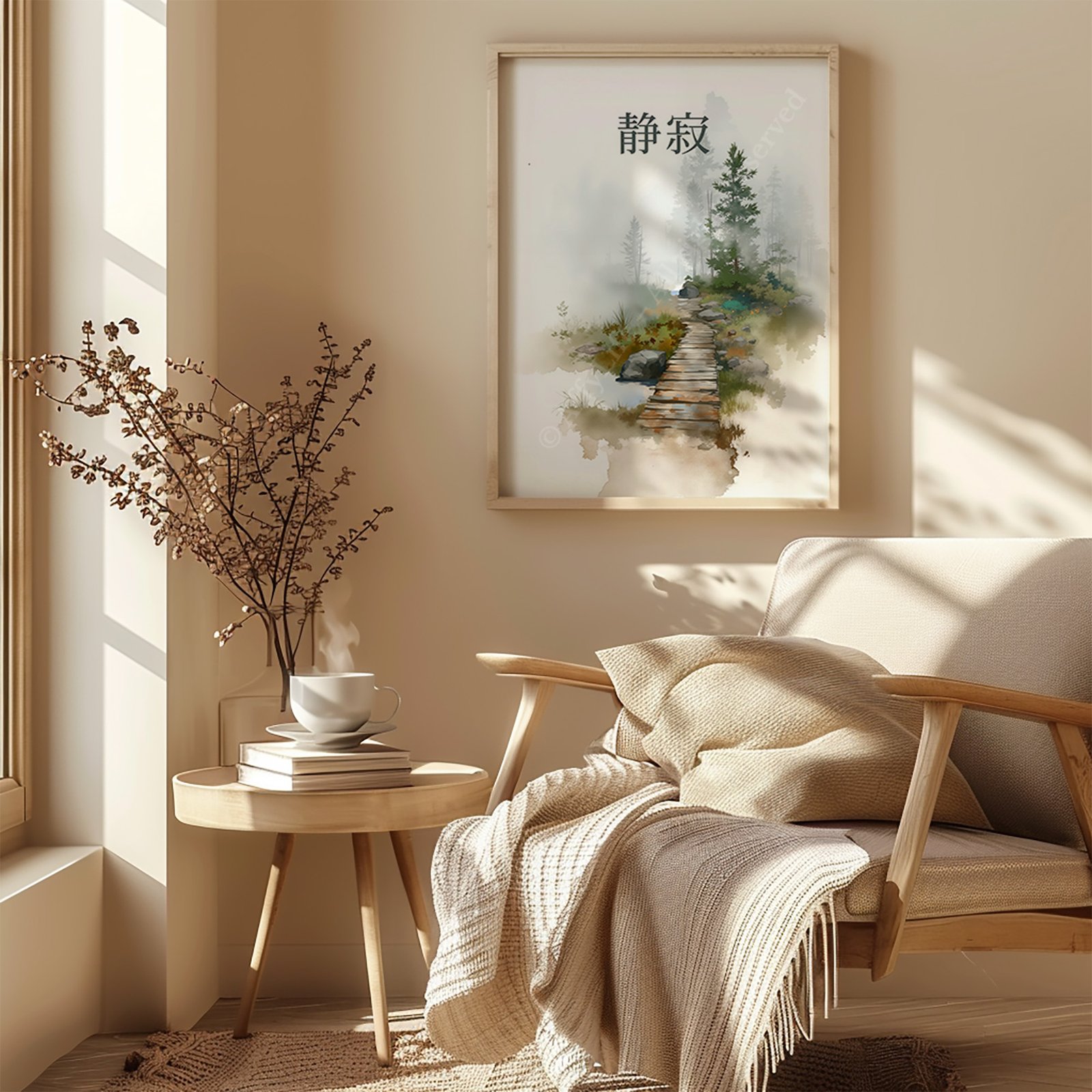 With a balanced, open composition and gentle color diffusion, the artwork captures the feeling of cool forest air after rain. The handwritten kanji character “静寂” anchors the scene with quiet strength. Ideal for Japandi, wabi-sabi, and slow-living interiors.